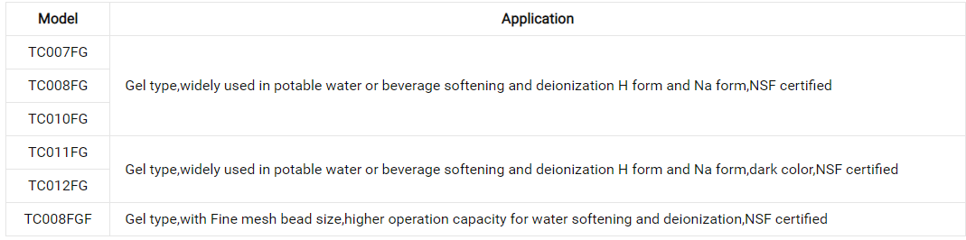 Sodium (Na+) strong base cation resin is commonly used for household, commercial and industrial water softening applications. According to the Water Quality Association, water hardness in the United States ranges from 1 to 350 grains (gpg) per gallon or 17.1 to 5,985 ppm. However, most waters range between 3 and 50 gpg.