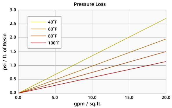 The graph above shows the expected pressure loss of Lanlang TA201DC per foot of bed depth as a function of flow rate at various temperatures. |