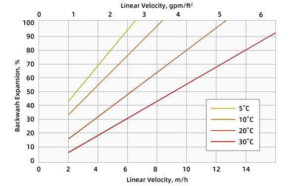 The graph above shows the expected pressure loss of Lanlang TA202-II per foot of bed depth as a function of flow rate at various temperatures. |